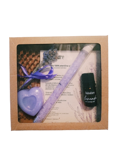 Lavanda je kraljica mediteranskog bilja i svim je poznat njen umirujući učinak. Razveselite svoju dragu osobu mini paketom u kojem se nalazi eterično ulje lavande 5ml, mini sapun srce ili školjka 30ml, mirisna sol za kupanje u epruveti i buketić mirisne lavande sa našeg polja.